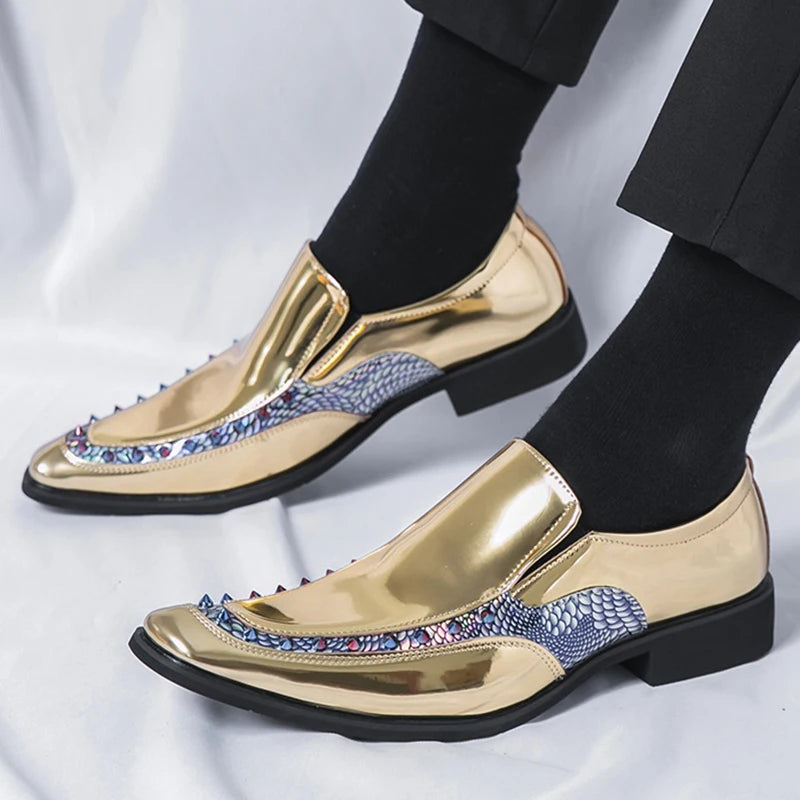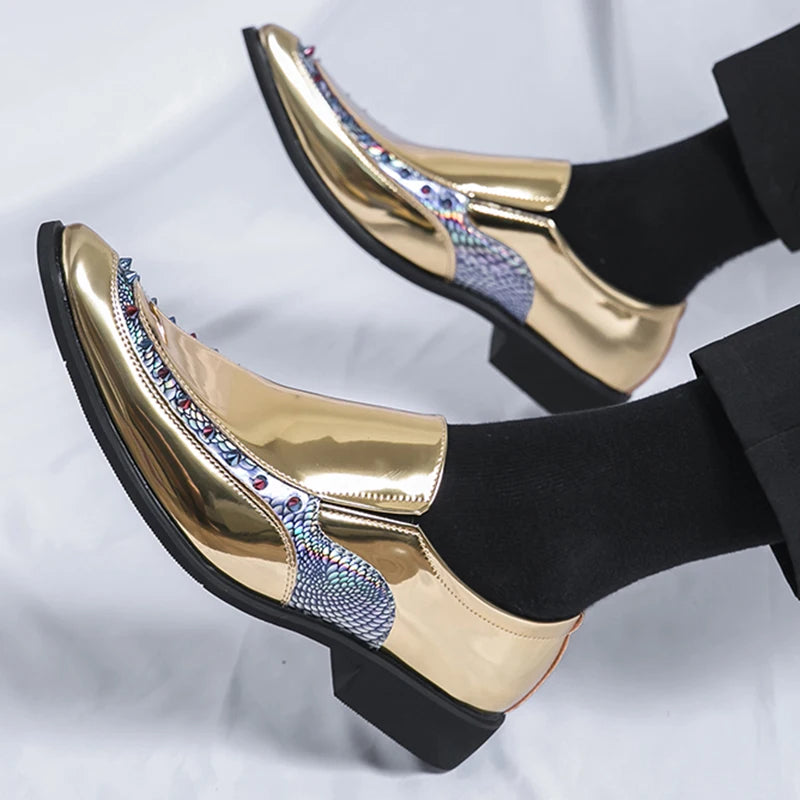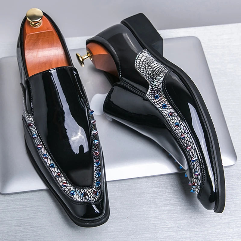 Crafted with a high-gloss finish and detailed mosaic trim, the Virello Dress Shoes deliver a standout look without compromising on comfort. The slip-on design features a smooth interior lining and solid outsole for all-day wear, while the reflective upper adds a bold edge to any formal fit. Made to turn heads, built to last.